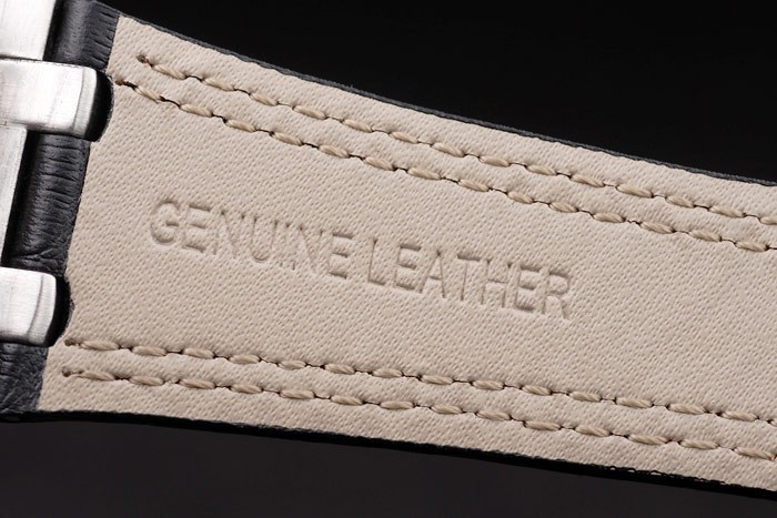 Bracelet: Heat embossed Audemars Piguet black crocodile leather strap with double red stitching and Audemars Piguet engraved brushed stainless steel fold-in clasp