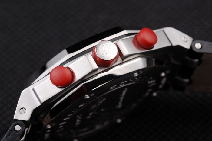 Crown: Red rubber hexagonal crown with the initials AP on stainless steel stud plus a red round rubber crown on either side of it