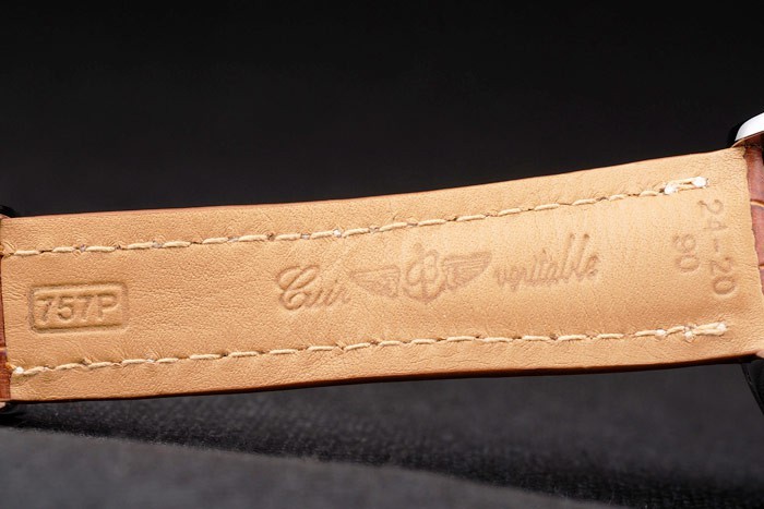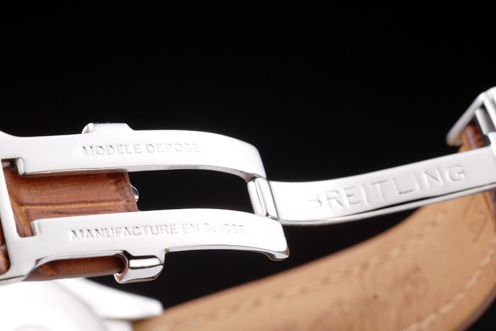 Bracelet: Brown crocodile leather strap with patent white stitching and heat embossed Breitling engravings and engraved stainless steel fold in clasp with Breitling logo on top