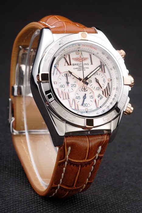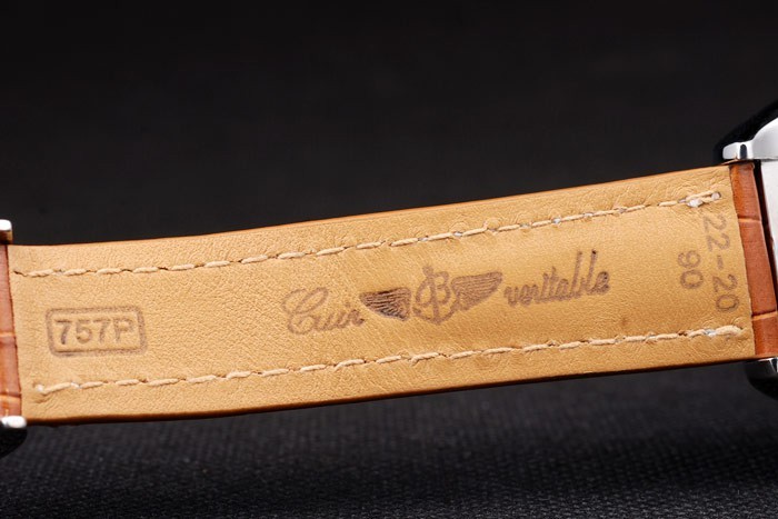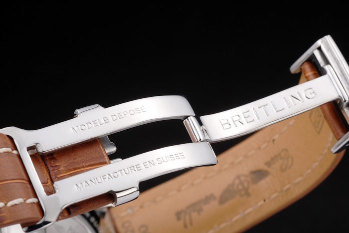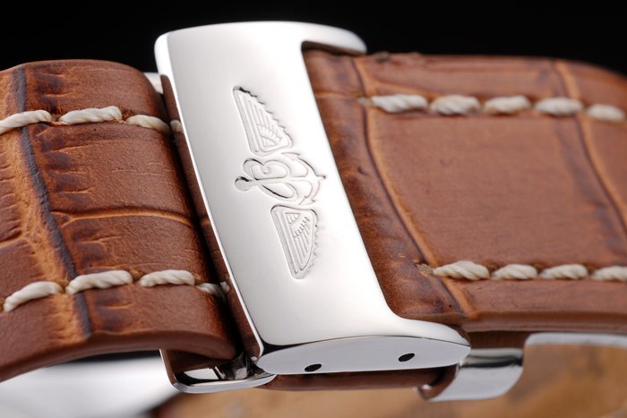 Bracelet: Brown crocodile leather strap with patent white stitching and heat embossed Breitling engravings and engraved stainless steel fold in clasp with Breitling logo on top