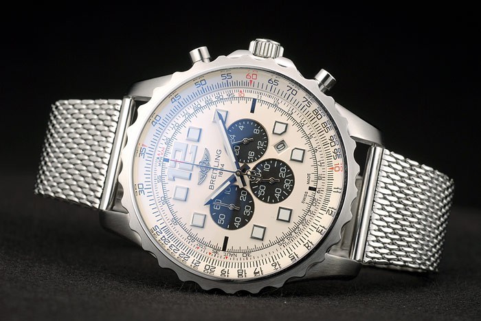 Crown: Polished stainless steel cutwork crown with Breitling logo and two small round push-button crowns on either side of it