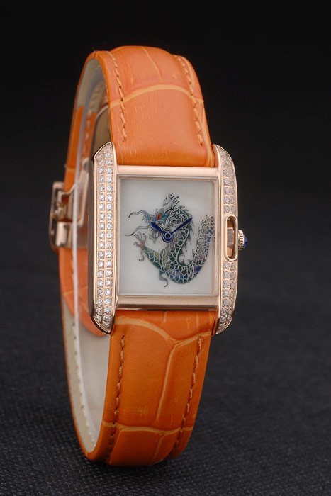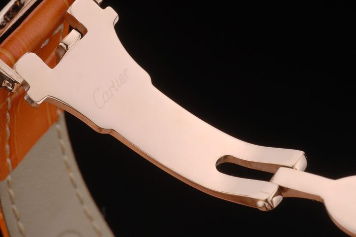 Bracelet: Cartier heat embossed orange crocodile leather strap with 18k rose-gold plated fold-in buckle clasp