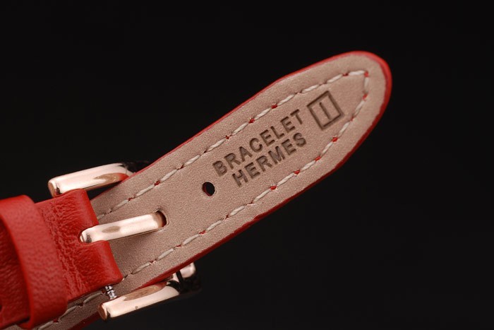 Bracelet: Elongated red leather strap with heat embossed Bracelet Hermes stamp and Hermes engraved rose-gold plated hook-buckle clasp
