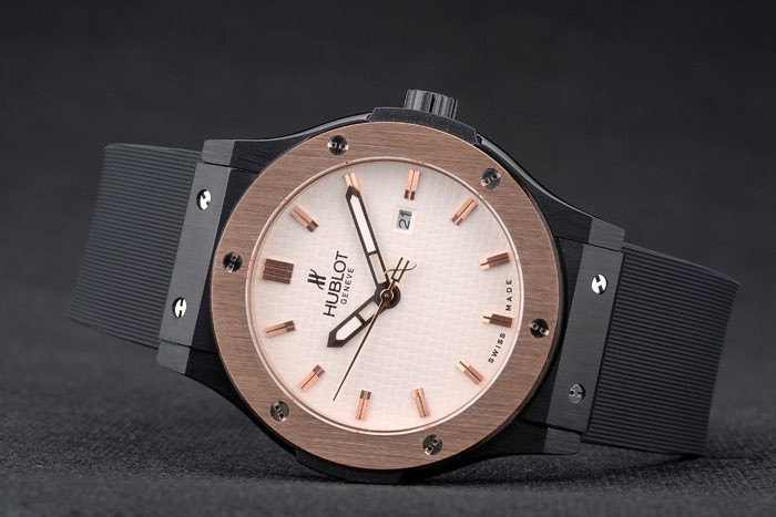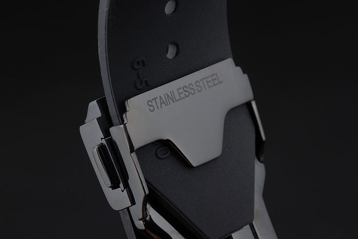Bracelet: Hublot Geneve heat embossed ribbed black rubber strap with Hublot Geneve engraved ion-plated push release hook clasp