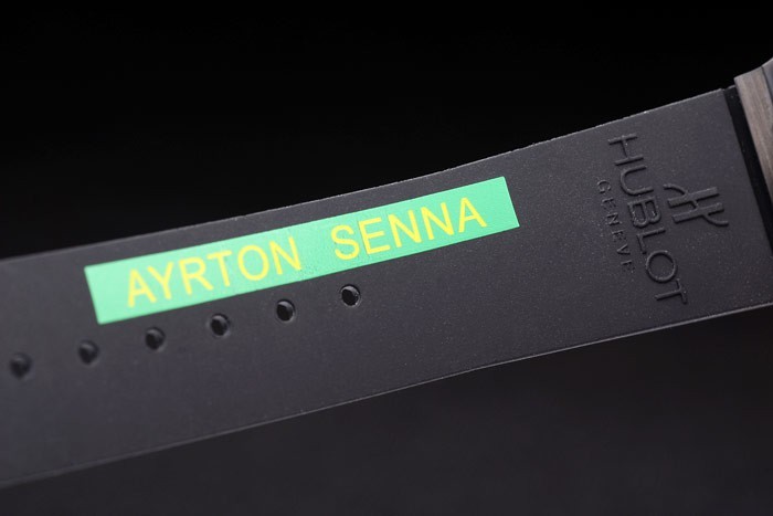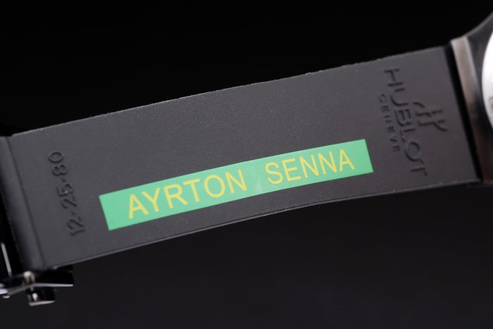 Bracelet: Ribbed black rubber strap with Hublot Geneve embossed on the inside along with green Ayrton Senna stamp and fold-over hook-buckle clasp with Hublot Geneve engraving