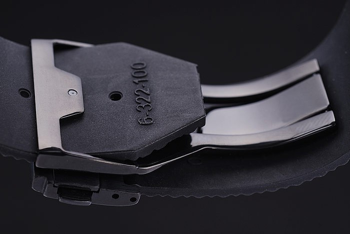 Bracelet: Textured black rubber band with ion-plated push-button hook clasp and Hublot engravings
