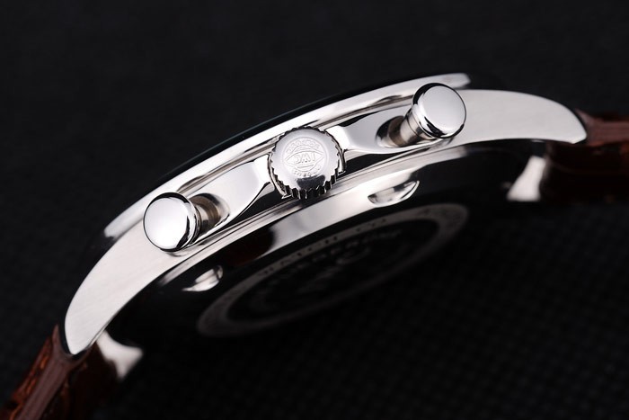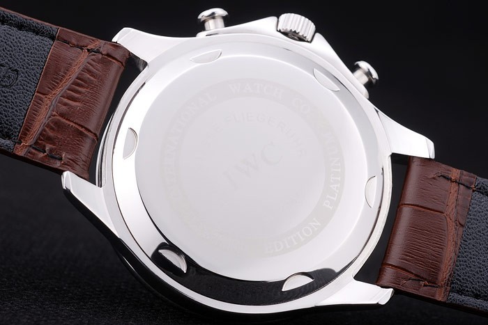 Crown: Polished stainless steel cutwork crown with IWC logo engraving and two smaller round push-button crowns on either side of it