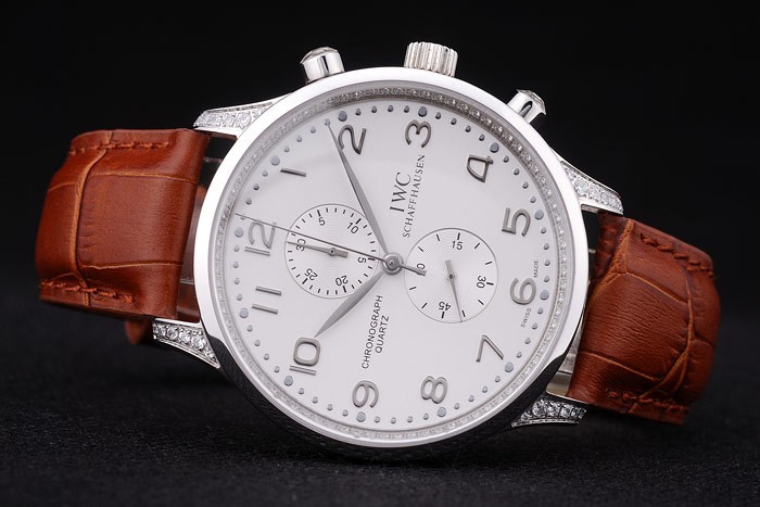 Crown: Polished stainless steel cutwork crown with IWC logo engraving and two smaller round push-button crowns on either side of it