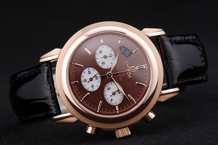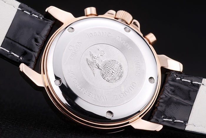 Crown: Rose-gold cutwork crown with Omega logo plus two additional crowns, one on either side of it