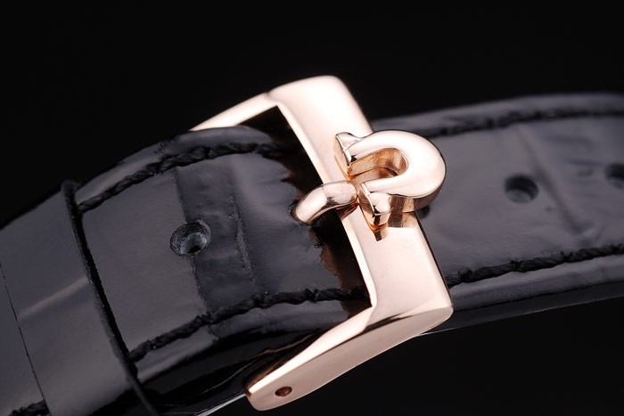Bracelet: Patent brown snake leather strap with heat embossed Omega stamp and thickly highlighted Omega logo hook-buckle rose-gold clasp