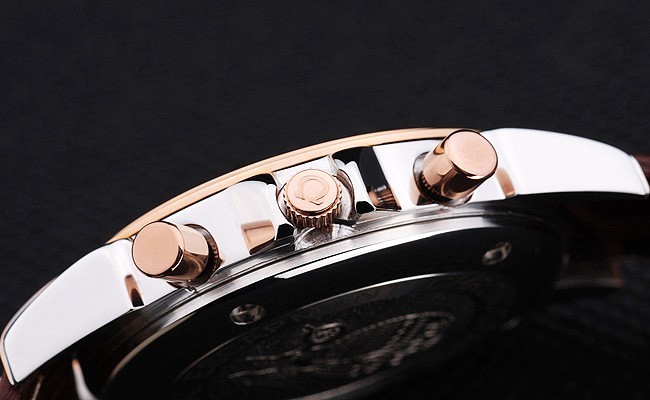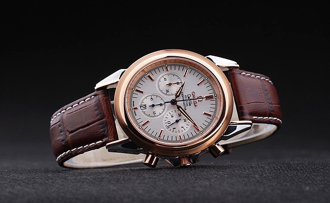 Bracelet: Brown crocodile leather strap with white stitching and Omega logo engraved yellow gold hook-buckle clasp