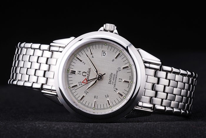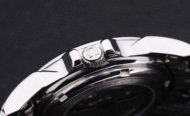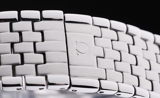 Crown: Polished stainless steel cutwork crown with Omega logo