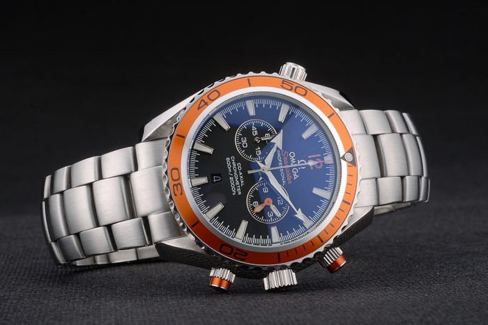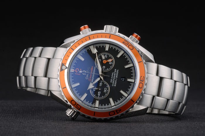 Back: Polished stainless steel snap in back with Omega logo and Planet Ocean Seamaster engravings