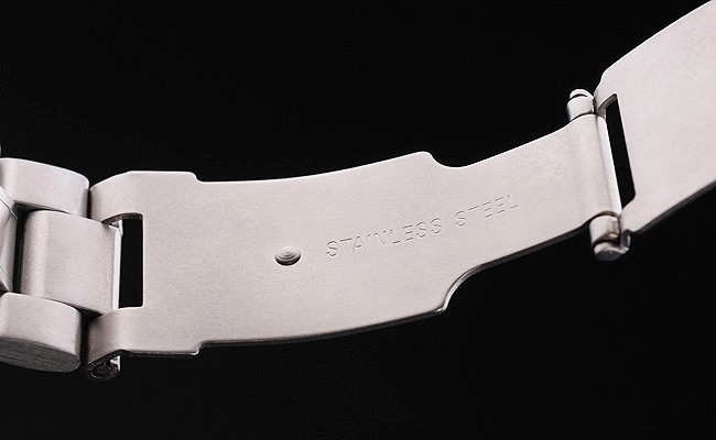 Bracelet: Brushed and polished stainless steel link bracelet with Omega engravings push button release deployment clasp