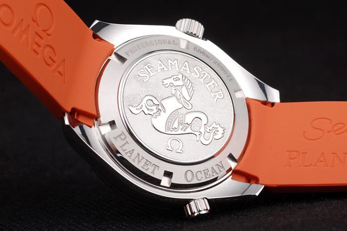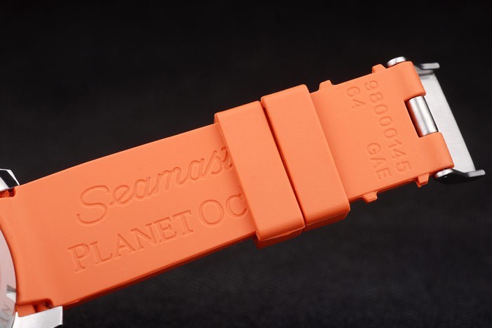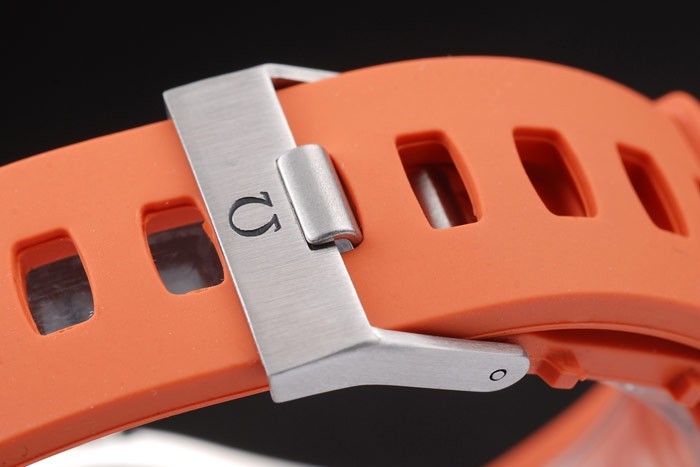 Bracelet: Orange rubber strap with Omega stamp and brushed stainless steel hook-buckle clasp with Omega logo on top