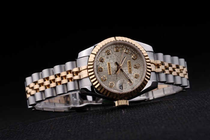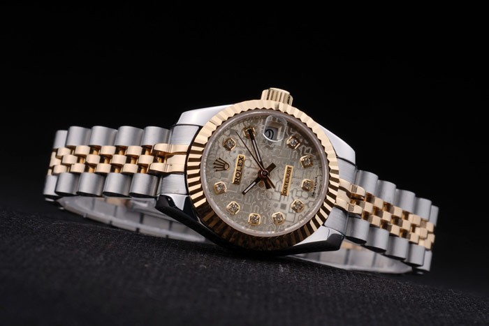 Bracelet: Two toned link bracelet in polished stainless steel and 18k yellow gold plated steel with Rolex engraving hidden clasp displaying the Rolex logo