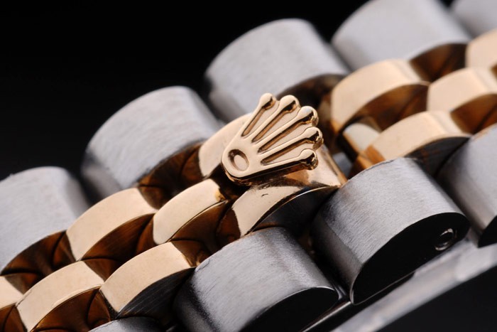 Crown: 18k yellow gold plated steel cutwork crown with Rolex logo