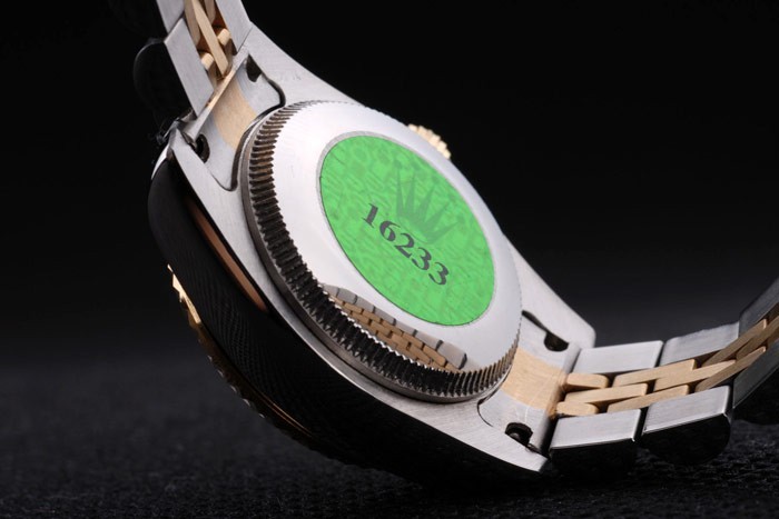 Back: Stainless steel push-in case back with green Rolex logo stamp