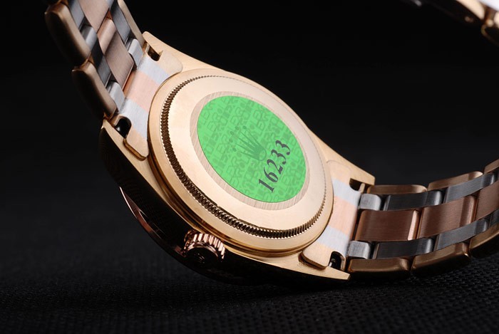 Back: 18k yellow gold plated stainless steel push-in case back with green Rolex logo stamp