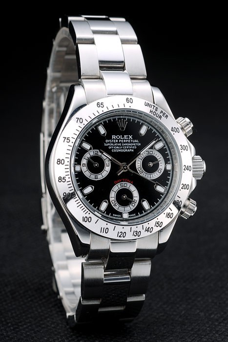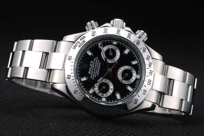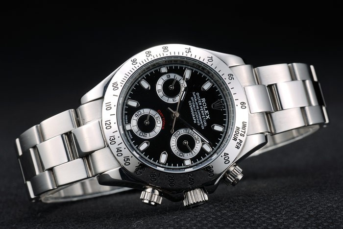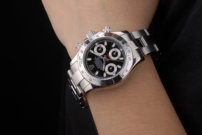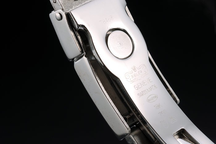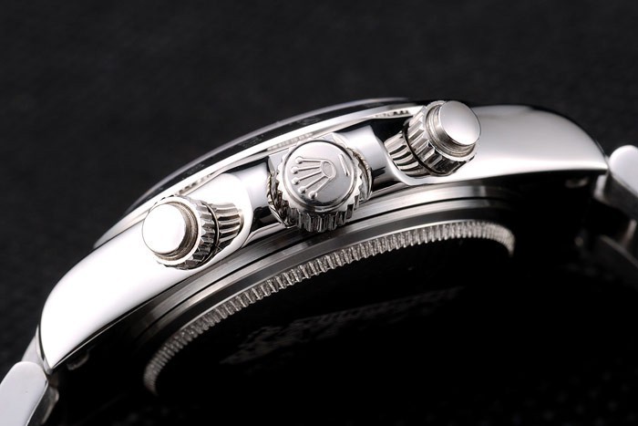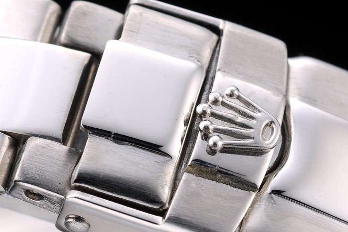 Crown: Polished stainless steel cutwork crown with Rolex logo and two smaller cutwork push button crowns on either side of it