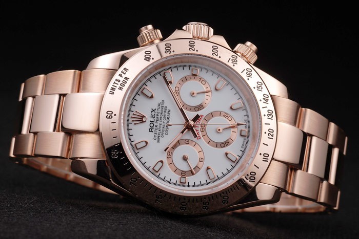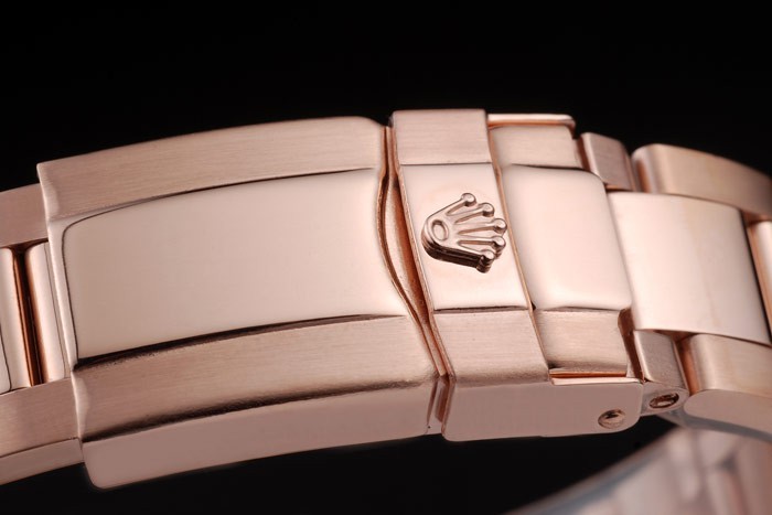 Bracelet: 18k rose-gold plated stainless steel link bracelet with Rolex engraved fold-in deployment clasp displaying the Rolex logo