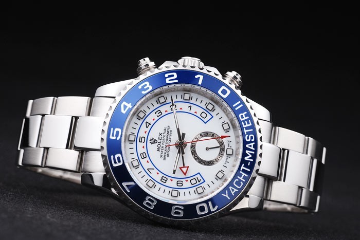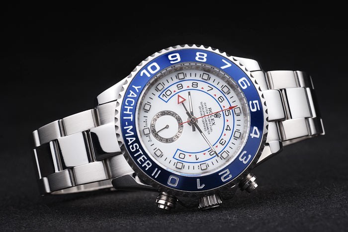 Bezel: Polished stainless steel unidirectional cutwork bezel with 1 to 10 markings and Yacht Master engraving on a blue enameled background