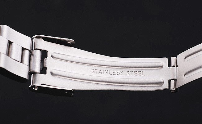 Bezel: Polished stainless steel with engraved Arabic numerals marking the minutes