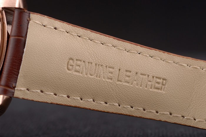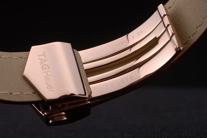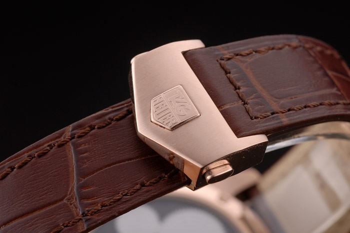 Bracelet: Heat embossed Tag Heuer brown crocodile leather strap with 18k rose-gold plated fold-in clasp with push release feature