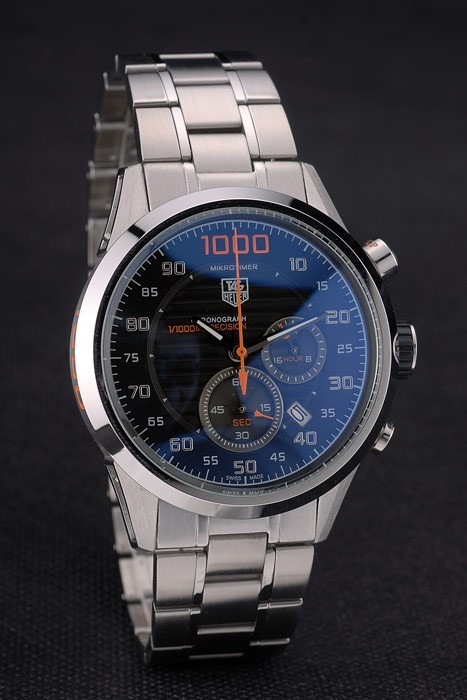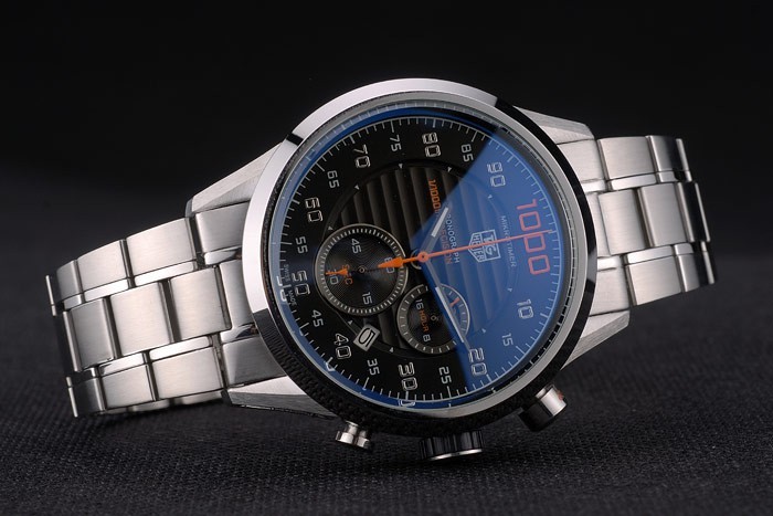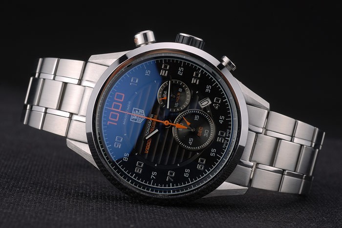 Crown: Polished stainless steel cutwork crown with Tag Heuer logo and two round push button crowns on either side of it