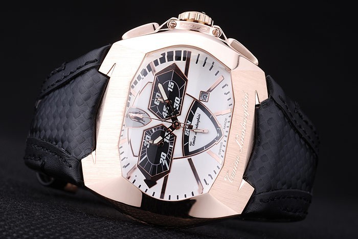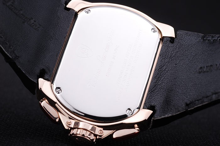 Bracelet: Black leather strap with heat embossed Tonino Lamborghini stamp and Tonino Lamborghini engraved and logo embossed rose-gold plated fold-in flip-over hook clasp