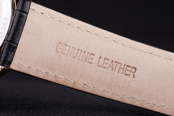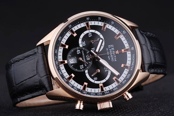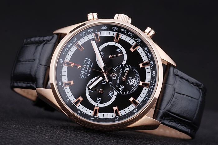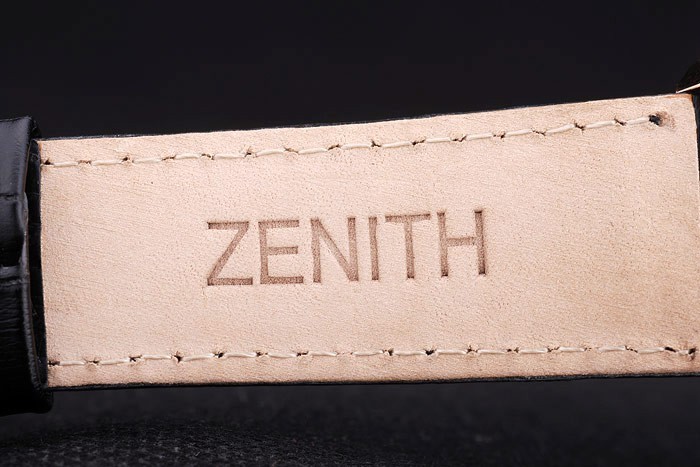Bracelet: Heat embossed Zenith black crocodile leather strap with rose-gold plated hook-buckle clasp