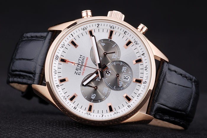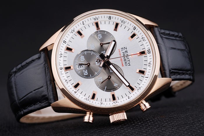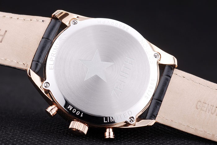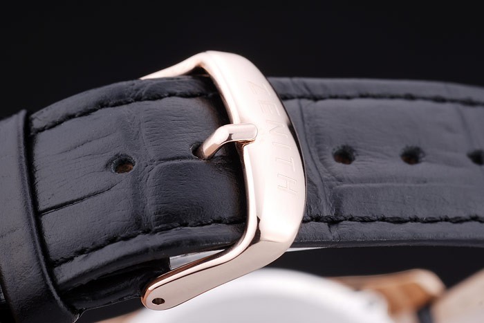 Bracelet: Heat embossed Zenith black crocodile leather strap with rose-gold plated hook-buckle clasp