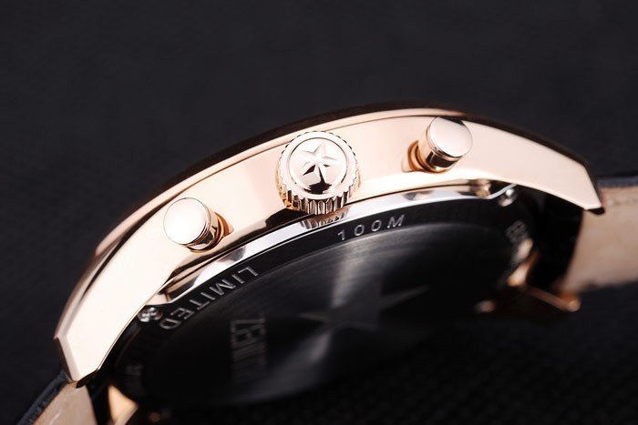 Crown: Rose-gold plated cutwork crown with Zenith star logo engraving and two smaller round push-button crowns on either side of it